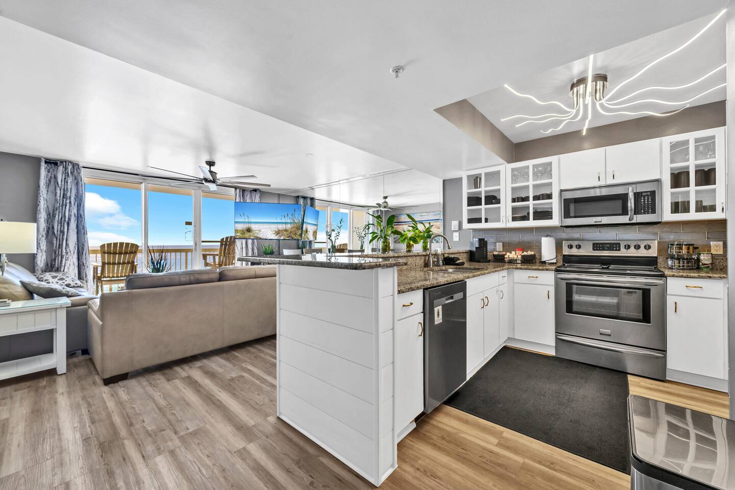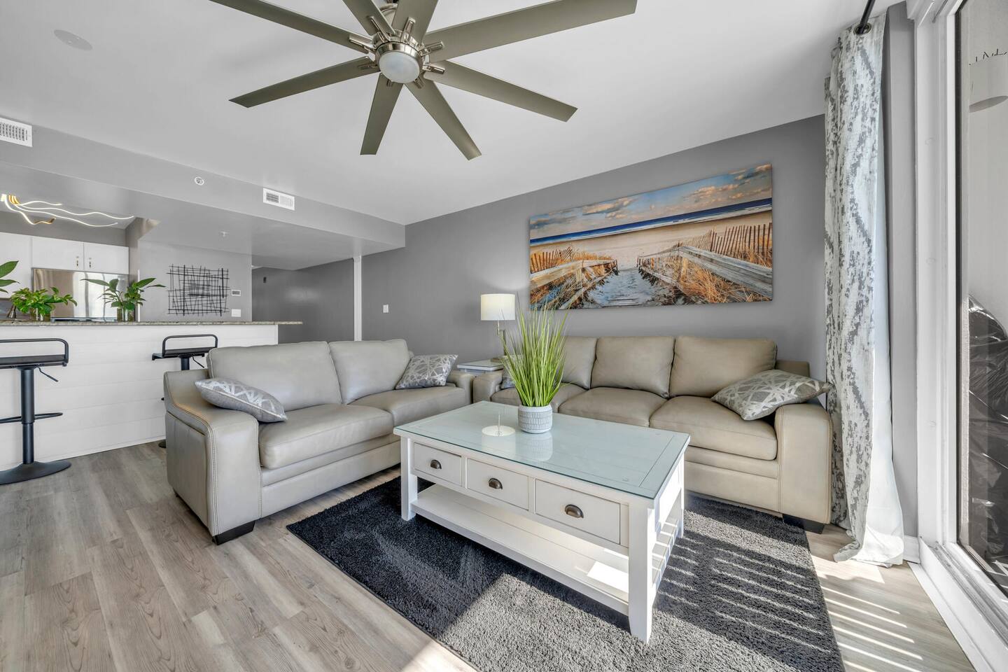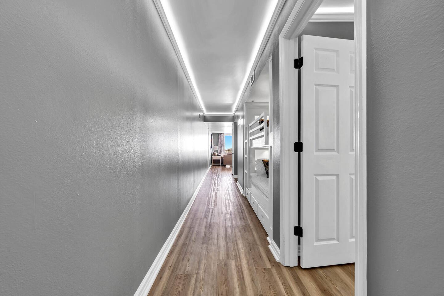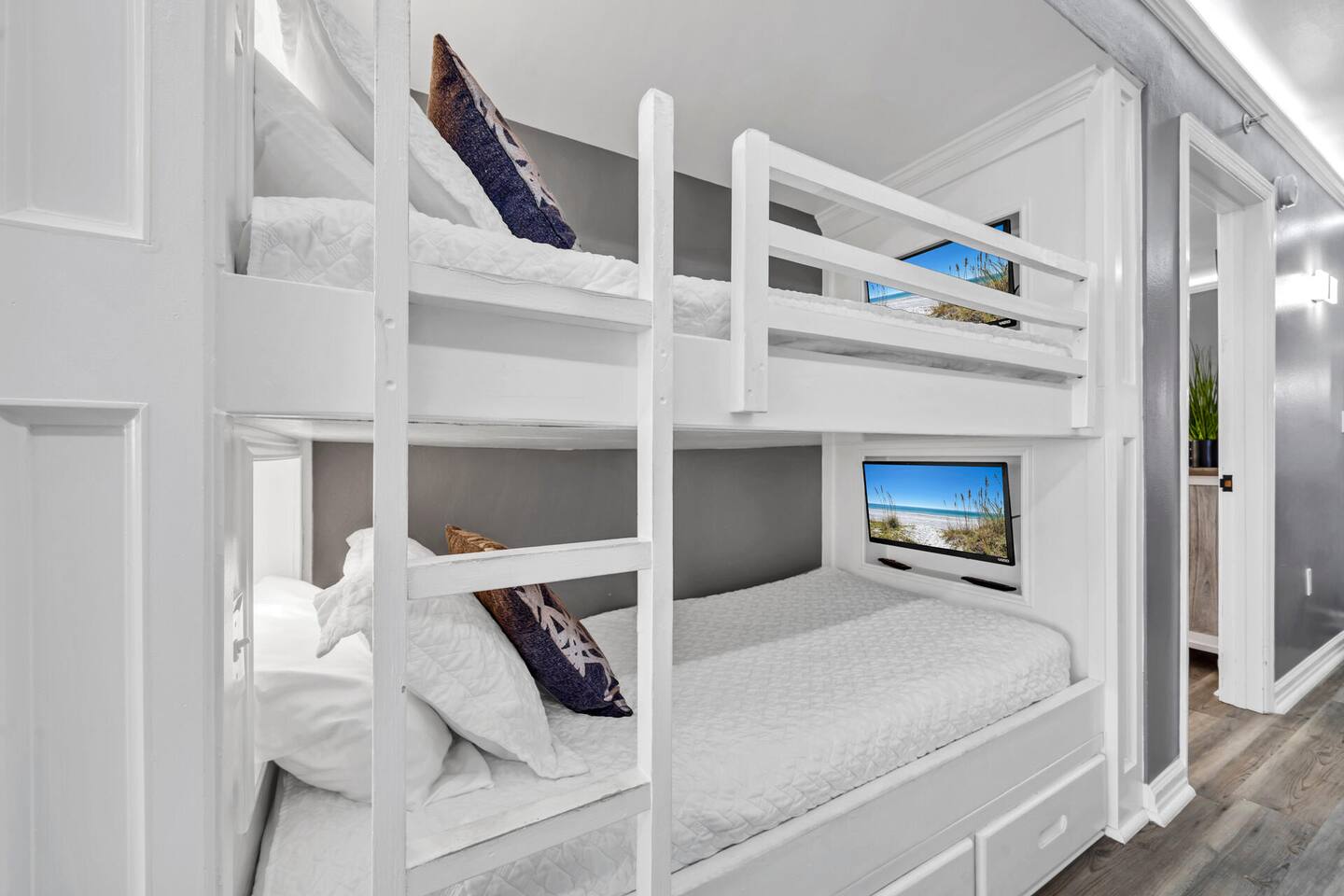 • RIGHT ON THE BEACH! Cannot get any closer to the beach than this unit • Sophisticated 1‑bedroom, 2‑bath layout accommodating up to 6 guests (6 adults will be tight, adults with kids are more comfortable • Master bedroom with a luxurious king bed • Hallway alcove with (2) custom built‑in bunk beds with own TV’s • Living room with a premium queen sleeper sofa • Newly renovated, open‑concept design with high‑end finishes • Fully stocked kitchen featuring bar seating and modern appliances • Private balcony showcasing sweeping, unobstructed Gulf views • Balcony has comfortable, smooth gliders • Located near the elevators for added convenience but may be noisy from foot traffic at times • 867 sq ft of thoughtfully designed living space