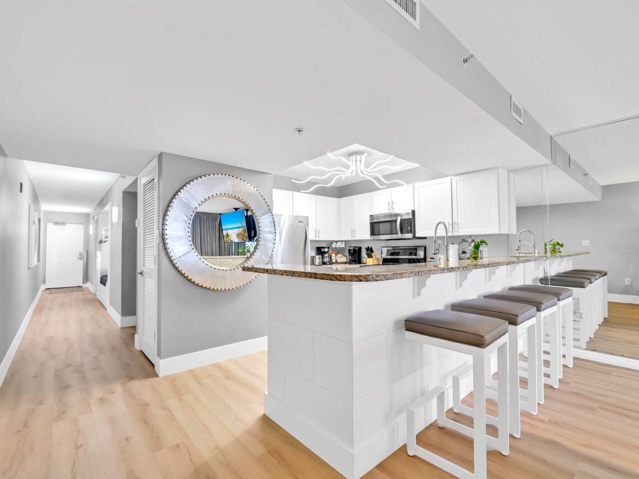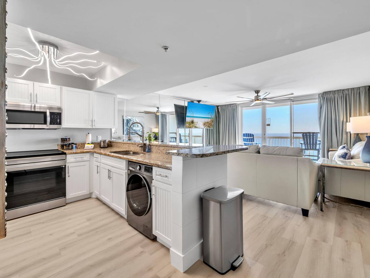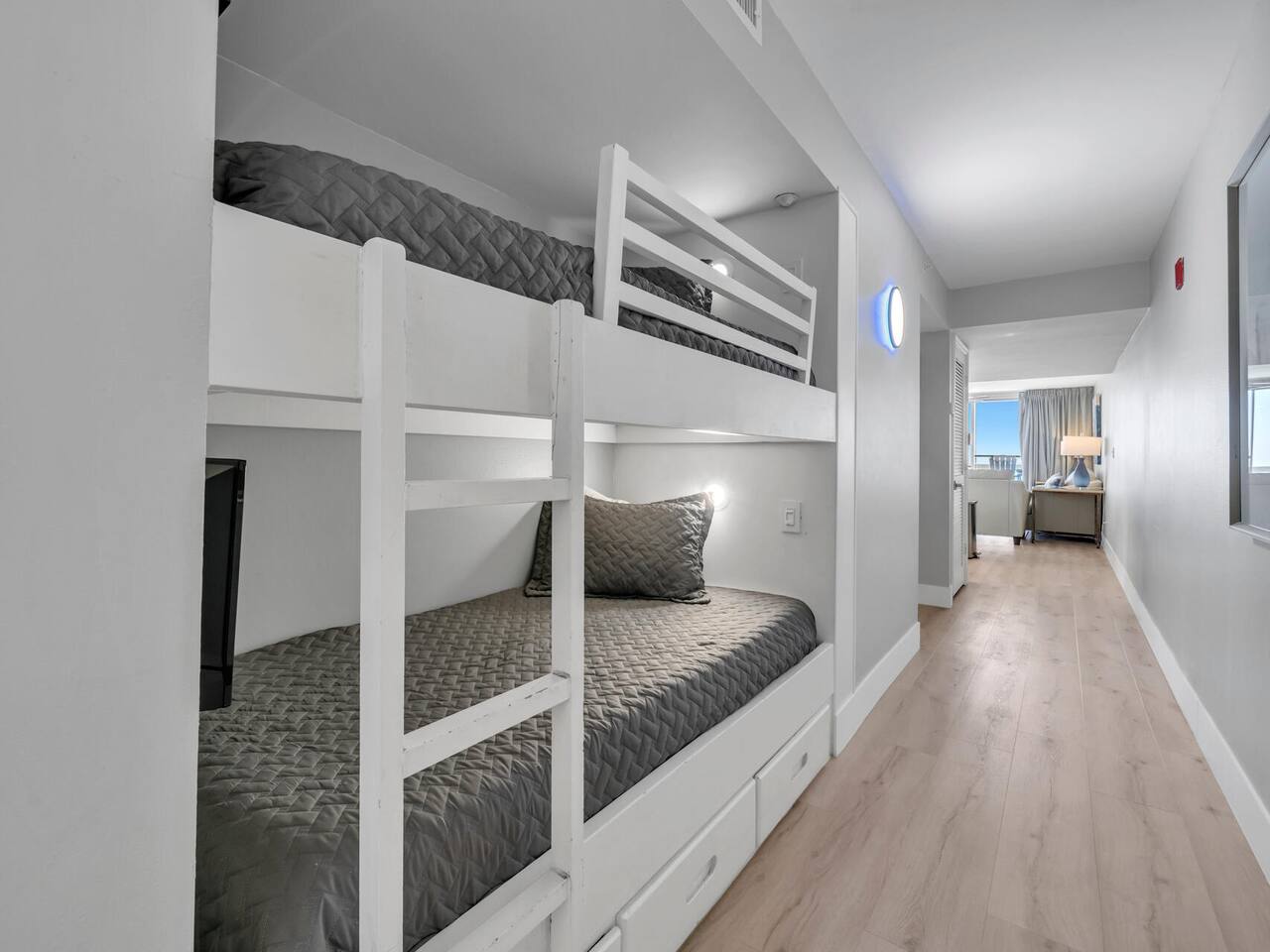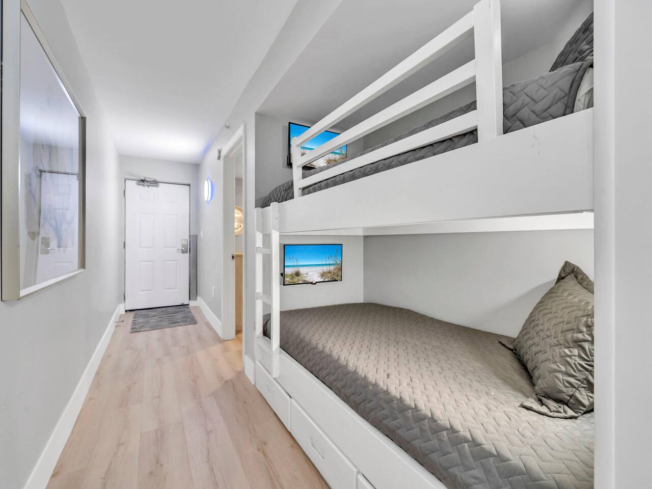 • RIGHT ON THE BEACH! Cannot get any closer to the beach than this unit • Sophisticated 1‑bedroom, 2‑bath layout accommodating up to 6 guests (6 adults will be tight, adults with kids are more comfortable • Master bedroom with a luxurious king bed • Hallway alcove with (2) custom built‑in bunk beds with own TV’s • Living room with a premium queen sleeper sofa • Newly renovated, open‑concept design with high‑end finishes • Fully stocked kitchen featuring bar seating and modern appliances • Private balcony showcasing sweeping, unobstructed Gulf views • Balcony has comfortable, smooth gliders • Located near the elevators for added convenience but may be noisy from foot traffic at times • 867 sq ft of thoughtfully designed living space • Although there is a washer/dryer in the unit, it is one of those wash to dry within the same cycle. It has a ventless dryer so it does not completely dry. It is very small and only capable of doing very small loads. Each load will take about 4 hours to run. Coin-operated washer and dryer for medium or large loads are also available on each floor.