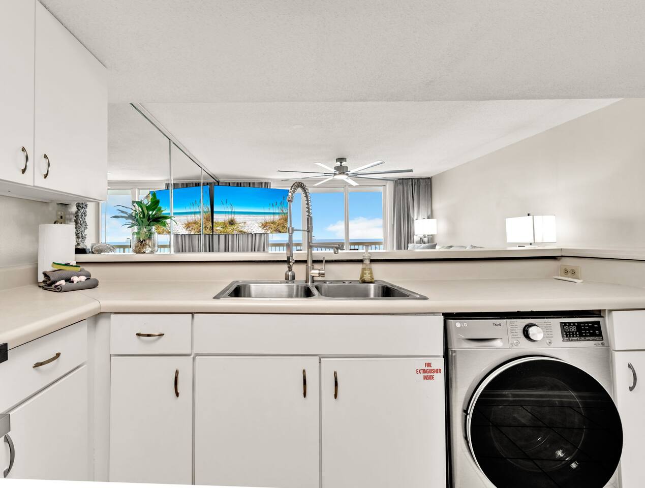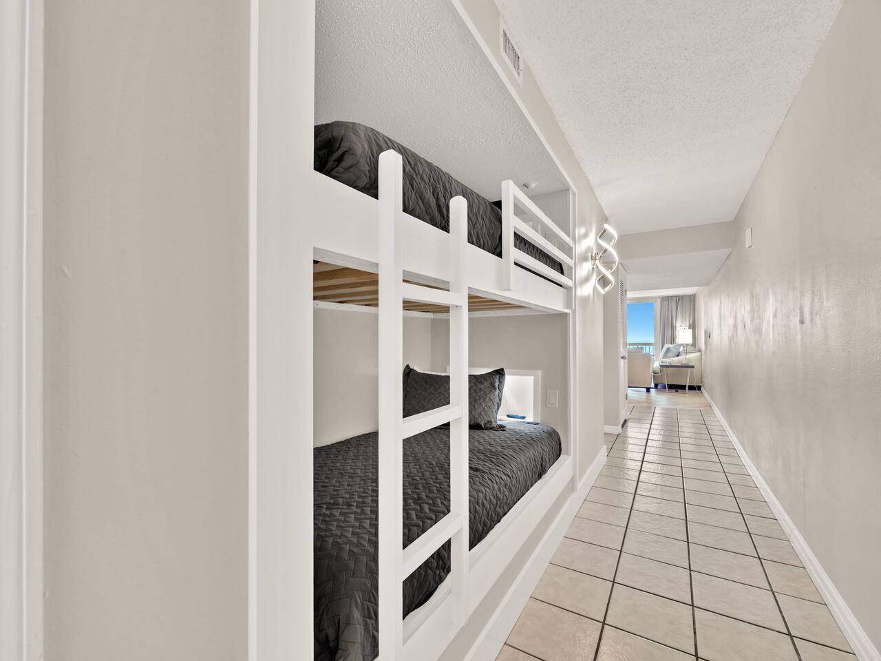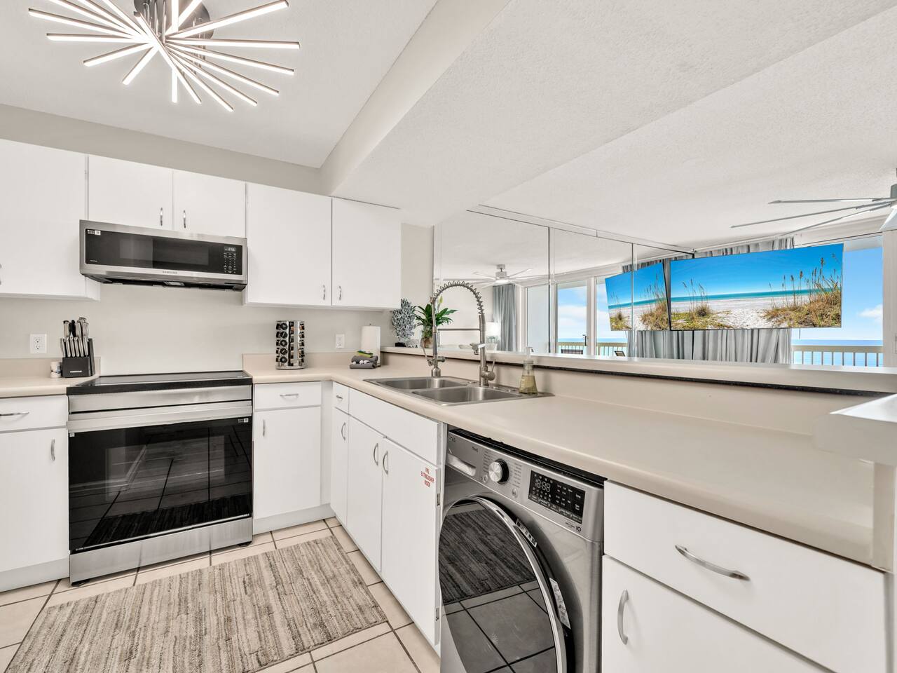 • RIGHT ON THE BEACH! Cannot get any closer to the beach than this unit • Sophisticated 1‑bedroom, 2‑bath layout accommodating up to 6 guests (6 adults will be tight, adults with kids are more comfortable • Master bedroom with a luxurious king bed • Hallway alcove with (2) custom built‑in bunk beds with own TV’s • Living room with a premium queen sleeper sofa • Newly renovated, open‑concept design with high‑end finishes • Fully stocked kitchen featuring bar seating and modern appliances • Private balcony showcasing sweeping, unobstructed Gulf views • Balcony has comfortable, smooth gliders • Located near the elevators for added convenience but may be noisy from foot traffic at times • 867 sq ft of thoughtfully designed living space • Although there is a washer/dryer in the unit, it is one of those wash to dry within the same cycle. It has a ventless dryer so it does not completely dry. It is very small and only capable of doing very small loads. Each load will take about 4 hours to run. Coin-operated washer and dryer for medium or large loads are also available on each floor.